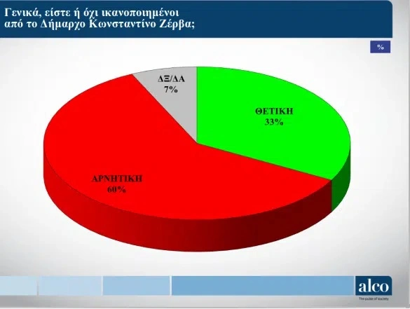 Εξι στους 10 Θεσσαλονικείς θέλουν νέο δήμαρχο Θεσσαλονίκης με το ίδιο ποσοστό να μην είναι ικανοποιημένοι από τον Κωνσταντίνο Ζέρβα. Μεγάλη έρευνα του MyPortal.gr που διενήργησε η εταιρεία Alco καταγράφει την άποψη των Θεσσαλονικέων για τη διοίκηση του Δήμου Θεσσαλονίκης και τα προβλήματα της πόλης. Συγκεκριμένα στην έρευνα, η οποία πραγματοποιήθηκε από την εταιρεία Alco από τις 12 ως τις 19 Απριλίου σε 700 άτομα που ψηφίζουν στο δήμο Θεσσαλονίκης, το 60% των θεσσαλονικέων δηλώνει πως δεν είναι ικανοποιημένο από τον Δήμαρχο έναντι ποσοστού 33% που δηλώνει ικανοποιημένο.