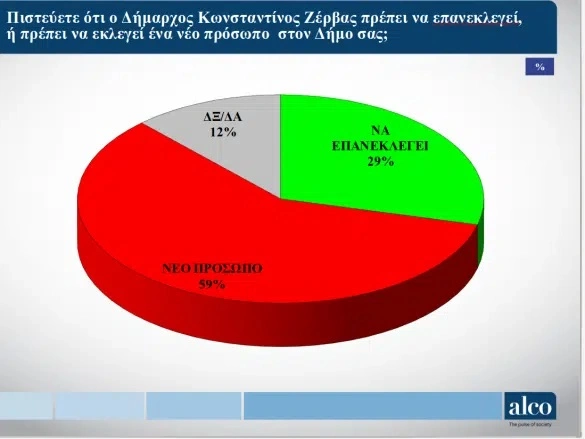 Συγκεκριμένα, στην ερώτηση «πιστεύετε ότι ο δήμαρχος Κωνσταντίνος Ζέρβας πρέπει να επανεκλεγεί ή να εκλεγεί νέο πρόσωπο», υπέρ νέου προσώπου τάσσεται το 59% ενώ το 29% επιθυμεί την επανεκλογή του κ. Ζέρβα. Η έρευνα καταγράφει και μια σειρά προβλημάτων της πόλης στα οποία ο Δήμος Θεσσαλονίκης βαθμολογείται από τους πολίτες αρνητικά, με αιχμή ζητήματα της καθημερινότητας όπως κυκλοφοριακό, στάθμευση και καθαριότητα.