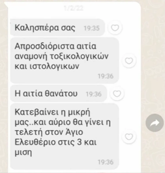 «Καλησπέρα σας. Απροσδιόριστα αίτια αναμονή τοξικολογικών και ιστολογικών, η αιτία θανάτου. Κατεβαίνει η μικρή μας… και αύριο θα γίνει η τελετή στον Άγιο Ελευθέριο στις 3 και μισή», αναφέρει χαρακτηριστικά το μήνυμα. Μάλιστα, σύμφωνα με το δελτίο ειδήσεων του τηλεοπτικού σταθμού, φέρεται οι γιατροί να παραξενεύτηκαν από την στάση της μητέρας, την οποία χαρακτήρισαν ψυχρή. Παράλληλα, αντίστοιχη άποψη φέρεται να έχει και ο γιατρός που ανακοίνωσε στη 33χρονη πως το παιδί πέθανε, καθώς ανέφερε ότι «δεν έμοιαζε με γονιό που έχασε το παιδί του».