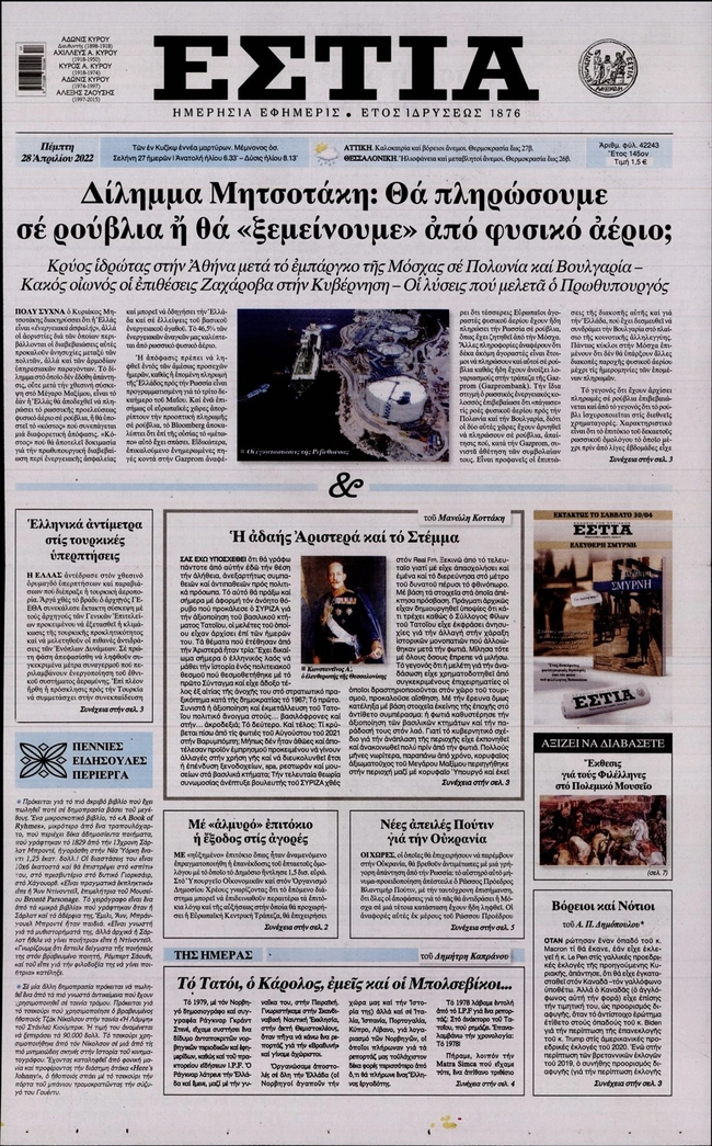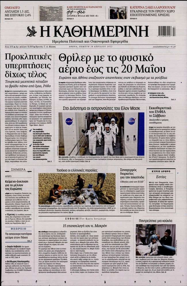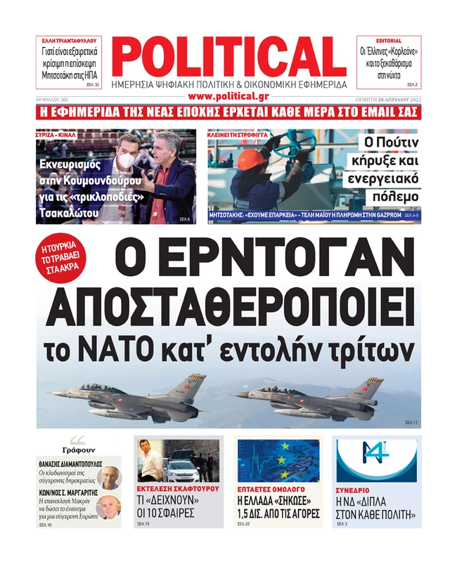 Τα πρωτοσέλιδα των ελληνικών εφημερίδων για σήμερα Πέμπτη 28 Απριλίου. Δείτε τι φιλοξενεί στην πρώτη του σελίδα ο πολιτικός και οικονομικός Τύπος και τα θέματα της επικαιρότητας που ξεχωρίζουν.