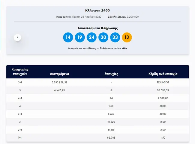 Σήμερα, Πέμπτη 28 Απριλίου 2022, στην κλήρωση Τζόκερ (2433) του ΟΠΑΠ, μοιράζεται στους τυχερούς της πρώτης κατηγορίας το ποσό των περίπου 3.290.000 ευρώ.