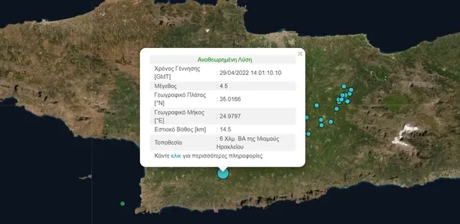 Σεισμική δόνηση μεγέθους 4,5 βαθμών της κλίμακας Ρίχτερ σημειώθηκε στις 17:01 το απόγευμα της Παρασκευής (29/4) στην Κρήτη, στο νότιο τμήμα του νομού Ηρακλείου, σύμφωνα με την αναθεωρημένη λύση του Γεωδυναμικού Ινστιτούτου. Ο σεισμός σημειώθηκε 6 χιλιόμετρα βορειοανατολικά της Μιαμούς Ηρακλείου και είχε εστιακό βάθος 14,5 χιλιόμετρα, ενώ έγινε ιδιαίτερα αισθητός σε όλο το νησί. Μέχρι στιγμής δεν έχουν αναφερθεί πληροφορίες για καταστροφές.