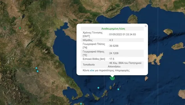 Σεισμική δόνηση μεγέθους 4,3 βαθμών της κλίμακας Ρίχτερ σημειώθηκε στις 04:33 στα ανοικτά της Αλοννήσου, όπως ανακοίνωσε το Γεωδυναμικό Ινστιτούτο του Εθνικού Αστεροσκοπείου Αθηνών.