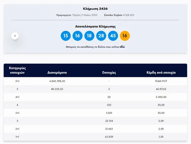 Σήμερα, Πέμπτη 5 Μαΐου 2022, στην κλήρωση Τζόκερ (2436) του ΟΠΑΠ, μοιράζεται στους τυχερούς της πρώτης κατηγορίας το ποσό των 4.800.000 ευρώ. Οι τυχεροί αριθμοί στη σημερινή κλήρωση Τζόκερ είναι οι εξής: 15, 16, 18, 28, 45 και Τζόκερ ο αριθμός 16.