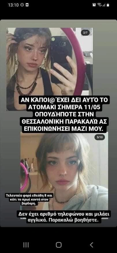 Συναγερμός έχει σημάνει στις Αρχές για την εξαφάνιση μιας 20χρονης από τη Θεσσαλονίκη, η οποία αγνοείται από χθες 11 Μαΐου. Η νεαρή εξαφανίστηκε από την περιοχή του Βαρδάρη και η ζωή της διατρέχει κίνδυνο. Το «Χαμόγελο του Παιδιού» εξέδωσε missing alert, ενώ στο διαδίκτυο έχουν αναρτήσει φωτογραφίες και φίλοι της που την αναζητούν. Μάλιστα, όπως αναφέρουν δεν έχει στην κατοχή της κινητό τηλέφωνο, ενώ μιλά αγγλικά.
