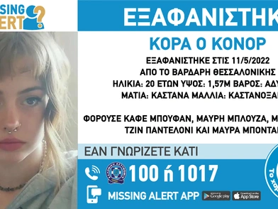 «Στις 11/5/22, εξαφανίστηκε από την περιοχή του Βαρδάρη στην Θεσσαλονίκη η Κόρα Ο Κόνορ, 20 ετών. Το «Χαμόγελο του Παιδιού» ενημερώθηκε για την εξαφάνιση της Κόρα Ο Κόνορ στις 11/5/2022 και προχώρησε στη δημοσιοποίηση των στοιχείων της ενήλικης καθώς συντρέχουν λόγοι οι οποίοι θέτουν τη ζωή της σε κίνδυνο.
