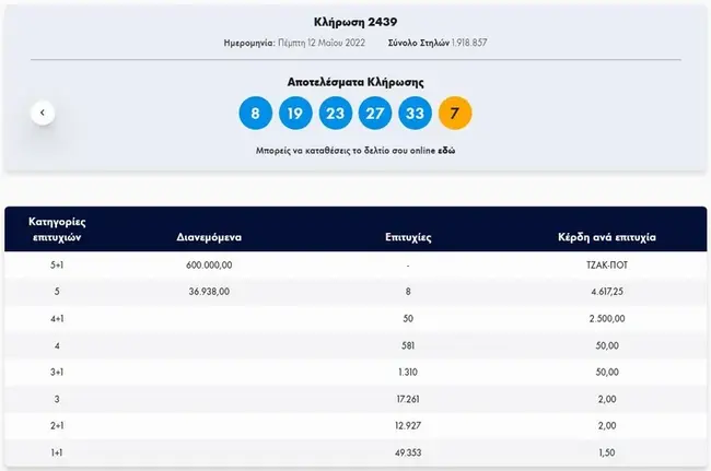 Οι τυχεροί αριθμοί που ανέδειξε η κληρωτίδα της αποψινής κλήρωσης είναι οι εξής: 27, 33, 23, 19, 8 και αριθμός Τζόκερ το 7.