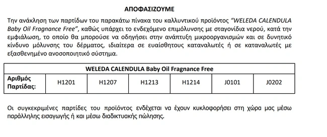 Συγκεκριμένα, ο ΕΟΦ αποφασίζει την ανάκληση των παρτίδων του παρακάτω πίνακα του καλλυντικού προϊόντος «WELEDA CALENDULA Baby Oil Fragnance Free», καθώς υπάρχει το ενδεχόμενο επιμόλυνσης με σταγονίδια νερού, κατά την εμφιάλωση, το οποίο θα μπορούσε να οδηγήσει στην ανάπτυξη μικροοργανισμών και σε δυνητικό κίνδυνο μόλυνσης του δέρματος, ιδιαίτερα σε ευαίσθητους καταναλωτές ή σε καταναλωτές με εξασθενημένο ανοσοποιητικό σύστημα.