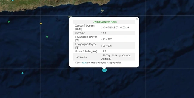 Σεισμός μεγέθους 4,1 βαθμών της κλίμακας Ρίχτερ σημειώθηκε στις 10:31, το πρωί της Παρασκευής (13/5) νότια της Κρήτης. Συγκεκριμένα, όπως αναφέρει το Γεωδυναμικό Ινστιτούτο, η σεισμική δόνηση σημειώθηκε 78 χιλιόμετρα νότια, νοτιοανατολικά της Χρυσής Λασιθίου και είχε εστιακό βάθος 7,9 χιλιόμετρα, ενώ ήταν ιδιαίτερα αισθητός στο νότιο τμήμα του νησιού.