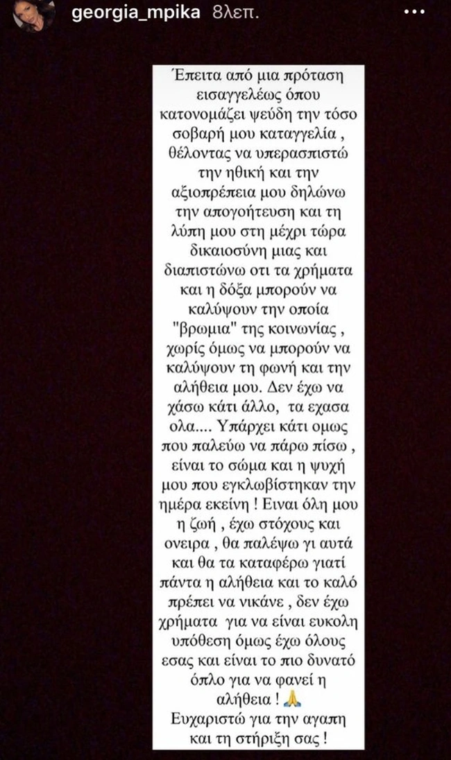 «Έπειτα από μια πρόταση της εισαγγελέως όπου κατονομάζει ψεύδη την τόσο σοβαρή μου καταγγελία, θέλοντας να υπερασπιστώ την ηθική και την αξιοπρέπειά μου δηλώνω την απογοήτευση και τη λύπη μου στη μέχρι τώρα δικαιοσύνη μιας και διαπιστώνω ότι τα χρήματα και η δόξα μπορούν να καλύψουν την όποια ''βρωμιά'' της κοινωνίας, χωρίς όμως να μπορούν να καλύψουν τη φωνή και την αλήθεια μου. Δεν έχω να χάσω κάτι άλλο, τα έχασα όλα… Υπάρχει κάτι, όμως, που παλεύω να πάρω πίσω, είναι το σώμα και η ψυχή μου που εγκλωβίστηκαν την ημέρα εκείνη! Είναι όλη μου η ζωή, έχω στόχους και όνειρα, θα παλέψω γι’ αυτά και θα τα καταφέρω γιατί πάντα η αλήθεια και το καλό πρέπει να νικάνε, δεν έχω χρήματα για να είναι εύκολη υπόθεση, όμως, έχω όλους εσάς και είναι το πιο δυνατό όπλο για να φανεί η αλήθεια! Ευχαριστώ για την αγάπη και τη στήριξή σας!», έγραψε.