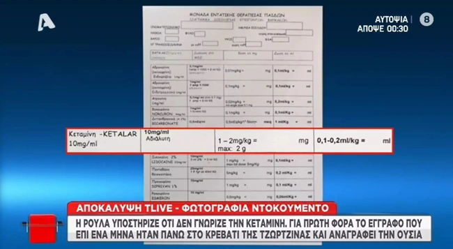Ωστόσο, το T-live παρουσίασε μία φωτογραφία ντοκουμέντο μέσα από την εντατική, όπου δείχνει το κρεβάτι της 9χρονης και ακριβώς πάνω από το προσκέφαλό της υπάρχει κρεμασμένο ένα έγγραφο. Πρόκειται για το διάγραμμα δοσολογίας επειγόντων φαρμάκων για την 9χρονη Τζωρτζίνα. Ανάμεσα στις ουσίες που αναφέρονται σε αυτό είναι και η κεταμίνη. Πρόκειται για ένα έγγραφο το οποίο έβλεπε καθημερινά επί έναν μήνα η Ρούλα Πισπιρίγκου που κατηγορείται για τον θάνατο της κόρης της. Το έγγραφο αυτό είχε παρουσιάσει το T-live στις 28/4.