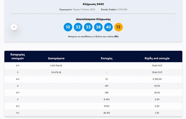 Σήμερα, Πέμπτη 19 Μαΐου 2022, στην κλήρωση Τζόκερ (2442) του ΟΠΑΠ, μοιράζεται στους τυχερούς της πρώτης κατηγορίας το ποσό του 1.000.000 ευρώ. Οι τυχεροί αριθμοί στη σημερινή κλήρωση Τζόκερ είναι οι εξής: 10, 32, 33, 38, 40 και Τζόκερ ο αριθμός 13.