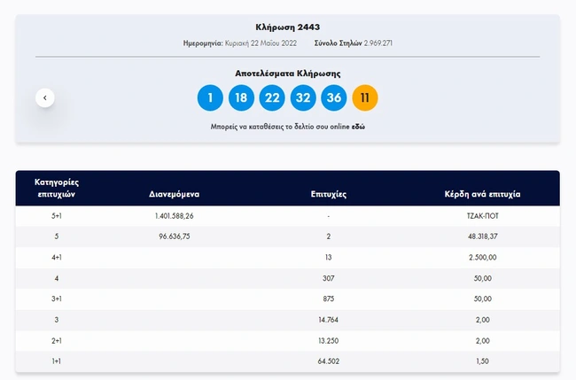 Σήμερα, Κυριακή 22 Μαΐου 2022, στην κλήρωση Τζόκερ (2443) του ΟΠΑΠ, μοιράζεται στους τυχερούς της πρώτης κατηγορίας το ποσό του 1.400.000 ευρώ. Οι τυχεροί αριθμοί στη σημερινή κλήρωση Τζόκερ είναι οι εξής: 1, 18, 22, 32, 36 και Τζόκερ ο αριθμός 11.