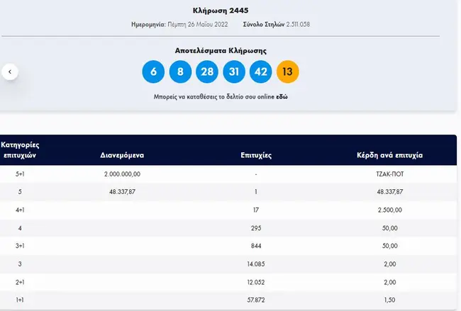Σήμερα, Πέμπτη 26 Μαΐου 2022, στην κλήρωση Τζόκερ (2445) του ΟΠΑΠ, μοιράζεται στους τυχερούς της πρώτης κατηγορίας το ποσό των περίπου 2.000.000 ευρώ. Οι τυχεροί αριθμοί στη σημερινή κλήρωση Τζόκερ είναι οι εξής: 6, 8, 28, 31, 42 και Τζόκερ ο αριθμός 13.