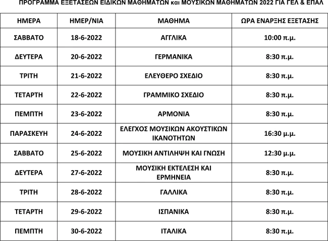 - για το μουσικό μάθημα «Μουσική Αντίληψη και Γνώση», η εξέταση στο αντικείμενο της Μουσικής Αντίληψης έχει διάρκεια 30’ λεπτών, ενώ η εξέταση στο αντικείμενο της Μουσικής Γνώσης έχει διάρκεια 2 ωρών.