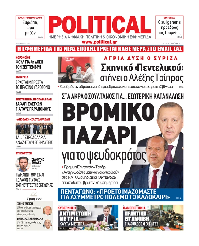 Τα πρωτοσέλιδα των ελληνικών εφημερίδων για σήμερα Τρίτη 31 Μαΐου. Δείτε τι φιλοξενεί στην πρώτη του σελίδα ο πολιτικός και οικονομικός Τύπος και τα θέματα της επικαιρότητας που ξεχωρίζουν.