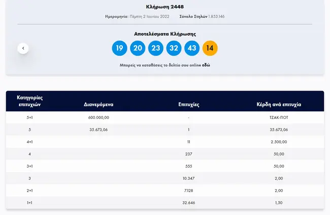 Σήμερα, Πέμπτη 2 Ιουνίου 2022, στην κλήρωση Τζόκερ (2448) του ΟΠΑΠ, μοιράζεται στους τυχερούς της πρώτης κατηγορίας το ποσό των περίπου 600.000 ευρώ. Οι τυχεροί αριθμοί στη σημερινή κλήρωση Τζόκερ είναι οι εξής: 19, 20, 23, 32, 43 και Τζόκερ ο αριθμός 14.