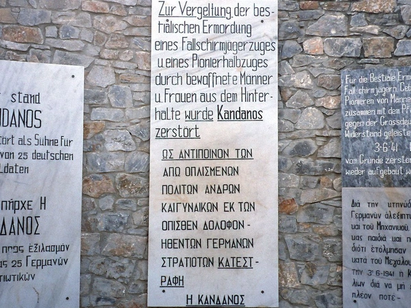 Ως αντίποινον των από οπλισμένων πολιτών, ανδρών και γυναικών, εκ των όπισθεν δολοφονηθέντων γερμανών στρατιωτών κατεστράφη η Κάνδανος. Δια την κτηνώδη δολοφονίαν γερμανών αλεξιπτωτιστών, αλπινιστών και του Μηχανικού, από άνδρας γυναίκας, παιδιά και παπάδες μαζί και διότι τόλμησαν να αντισταθούν κατά του Μεγάλου Ράιχ, κατεστράφη την 3η-6-1941 η Κάνδανος εκ θεμελίων δια να μη επανοικοδομηθή πλέον ποτέ», έγραφαν οι πινακίδες που τοποθέτησαν οι Γερμανοί στις εισόδους του ερειπωμένου χωριού και απαγόρευσαν με ποινή θανάτου την επίσκεψη του χώρου, καθώς και την ανοικοδόμησή του.