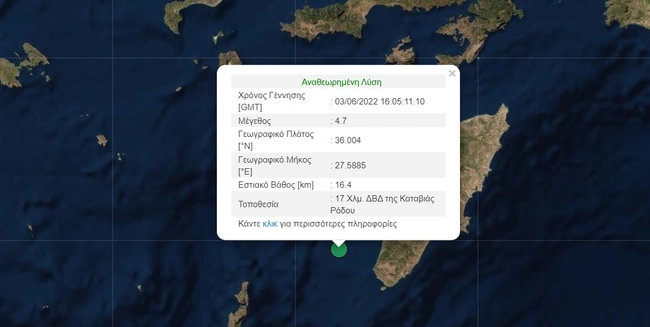 Σεισμική δόνηση μεγέθους 4,7 βαθμών της κλίμακας Ρίχτερ σημειώθηκε στη Ρόδο το απόγευμα της Παρασκευής (3/6). Συγκεκριμένα, σύμφωνα με την Αναθεωρημένη Λύση του Γεωδυναμικού Ινστιτούτου, ο σεισμός σημειώθηκε στις 19:05, 17 χιλιόμετρα δυτικά, βορειοδυτικά της Καταβιάς Ρόδου και είχε εστιακό βάθος 16,4 χιλιόμετρα.