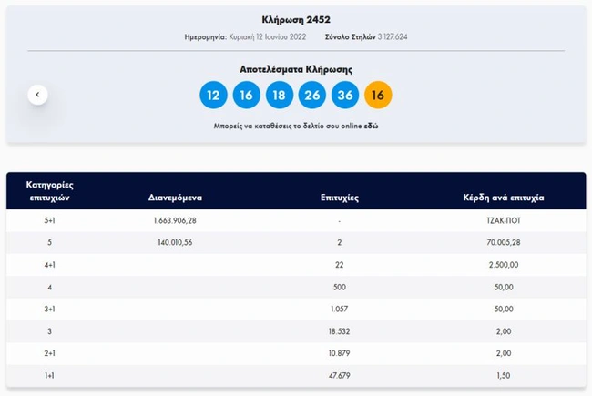 Σήμερα, Κυριακή 12 Ιουνίου 2022, στην κλήρωση Τζόκερ (2452) του ΟΠΑΠ, μοιράζεται στους τυχερούς της πρώτης κατηγορίας το ποσό των περίπου 1.600.000 ευρώ. Οι τυχεροί αριθμοί στη σημερινή κλήρωση Τζόκερ είναι οι εξής: 12, 16, 18, 26, 36 και Τζόκερ ο αριθμός 16.