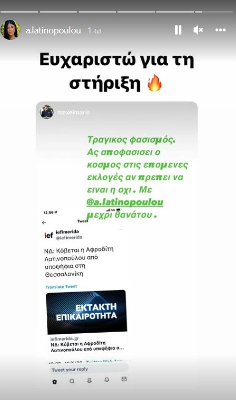 Οπως αναφέρουν πηγές από τη Νέα Δημοκρατία, η πολιτεύτρια Αφροδίτη Λατινοπούλου δεν έχει κανένα αξίωμα ή θέση στο οργανόγραμμα της Νέας Δημοκρατίας, ούτε σε τοπικό ούτε σε κεντρικό επίπεδο και δεν θα είναι υποψήφια στις επόμενες εθνικές εκλογές. Μέσα από ένα Instagram Story η Αφροδίτη Λατινοπούλου δημοσίευσε το σχόλιο ενός χρήστη: «τραγικός φασισμός. Ας αποφασίσει ο κόσμος στις επόμενες εκλογές αν πρέπει να είναι η όχι. Με την Λατινοπούλου μέχρι θανάτου» και ευχαρίστησε για τη στήριξη.