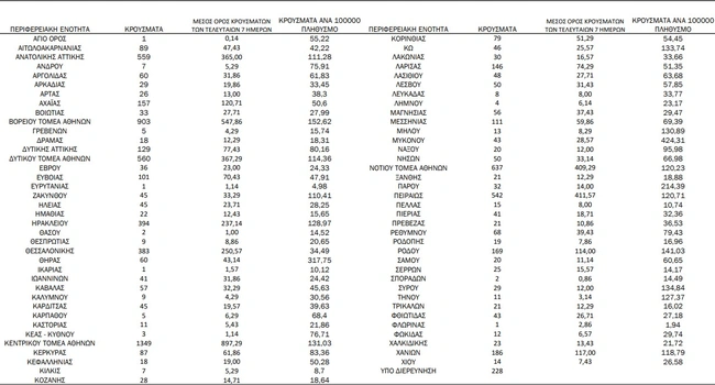 Από τα 7.158 νέα κρούσματα τα 4.729 εντοπίστηκαν στην Αττική και τα 383 στη Θεσσαλονίκη. Η κατανομή στις περιφερειακές ενότητες όλης της χώρας: