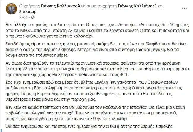 «Δεν άλλαξε -καιρικώς- απολύτως τίποτα. Όπως σας έχω ειδοποιήσει εδώ και σχεδόν 10 ημέρες από το MEGA, από την Τετάρτη 22 Ιουνίου και έπειτα έρχεται αρκετή ζέστη και πιθανότατα και ο πρώτος καύσωνας για το φετινό καλοκαίρι. Επειδή όμως είμαστε αρκετές ημέρες μπροστά, ακόμη δεν μπορεί να προβλεφθεί ποια θα είναι διάρκεια αυτής της θερμής εισβολής. Μπορεί να είναι από σύντομη έως και μεγάλη. Θα τα δούμε αυτά τις επόμενες ημέρες.
