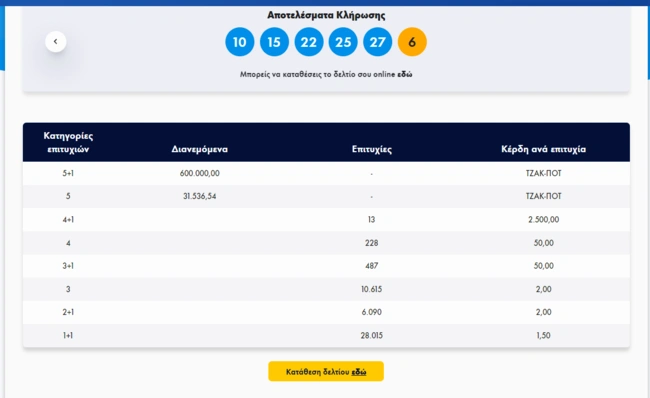 Σήμερα, Τρίτη 21 Ιουνίου 2022, στην κλήρωση Τζόκερ του ΟΠΑΠ, μοιράζεται στους τυχερούς της πρώτης κατηγορίας το ποσό των 600.000 ευρώ. Η κληρωτίδα δεν ανέδειξε κάποιον υπερτυχερό, καθώς υπήρξε τζακ ποτ. Οι τυχεροί αριθμοί στη σημερινή κλήρωση Τζόκερ είναι οι εξής: 10, 15, 22, 25, 27 και Τζόκερ ο αριθμός 6.