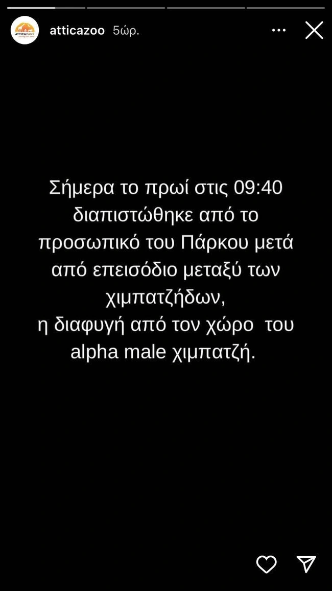 Συγκεκριμένα, στην ανακοίνωση αναφέρεται: «Σήμερα το πρωί στις 09:40 διαπιστώθηκε από το προσωπικό του Πάρκου μετά από επεισόδιο μεταξύ των χιμπατζήδων, η διαφυγή από τον χώρο του alpha male χιμπατζή.