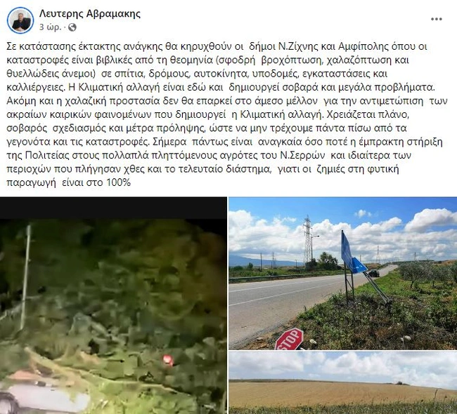 Ο βουλευτής Σερρών του ΣΥΡΙΖΑ, Λευτέρης Αβραμάκης, ανακοίνωσε μέσω Facebook ότι οι δήμοι της Νέας Ζίχνης Σερρών θα κηρυχθούν σε κατάσταση έκτακτης ανάγκης. «Σε κατάστασης έκτακτης ανάγκης θα κηρυχθούν οι δήμοι Ν. Ζίχνης και Αμφίπολης, όπου οι καταστροφές είναι βιβλικές από τη θεομηνία (σφοδρή βροχόπτωση, χαλαζόπτωση και θυελλώδεις άνεμοι) σε σπίτια, δρόμους, αυτοκίνητα, υποδομές, εγκαταστάσεις και καλλιέργειες.