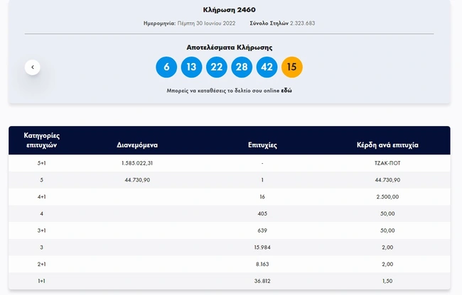 Σήμερα, Πέμπτη 30 Ιουνίου 2022, στην κλήρωση Τζόκερ (2460) του ΟΠΑΠ, μοιράζεται στους τυχερούς της πρώτης κατηγορίας το ποσό των 1.500.000 ευρώ. Οι τυχεροί αριθμοί στη σημερινή κλήρωση Τζόκερ είναι οι εξής: 6, 13, 22, 28, 42 και Τζόκερ ο αριθμός 15.