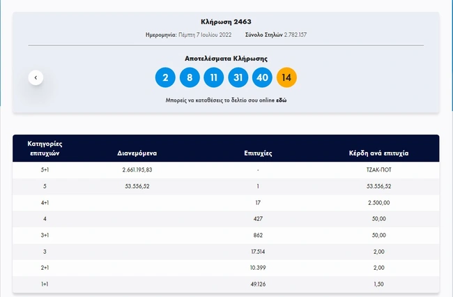 Σήμερα, Πέμπτη 7 Ιουλίου 2022, στην κλήρωση Τζόκερ (2463) του ΟΠΑΠ, μοιράζεται στους τυχερούς της πρώτης κατηγορίας το ποσό των 2.600.000 ευρώ. Οι τυχεροί αριθμοί στη σημερινή κλήρωση Τζόκερ είναι οι εξής: 2, 8, 11, 31, 40 και Τζόκερ ο αριθμός 14.