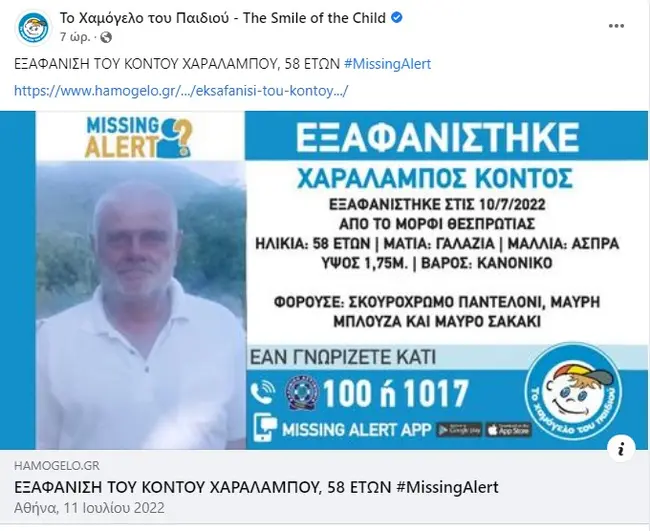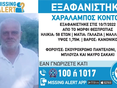 Συναγερμός έχει σημάνει στις Αρχές για την εξαφάνιση από την περιοχή Μόρφι Θεσπρωτίας του 58χρονου Χαράλαμπου Κόντου τα ίχνη του οποίου χάθηκαν την Κυριακή 10 Ιουλίου. Το «Χαμόγελο του Παιδιού» ενημερώθηκε για την εξαφάνιση του 58χρονου στις 11/7/2022 και άμεσα προχώρησε στη δημοσιοποίηση των στοιχείων του ενήλικου καθώς ενδέχεται να συντρέχουν λόγοι οι οποίοι θέτουν τη ζωή του σε κίνδυνο.