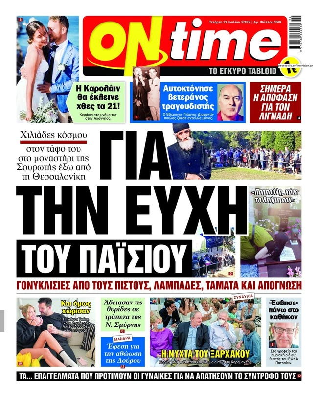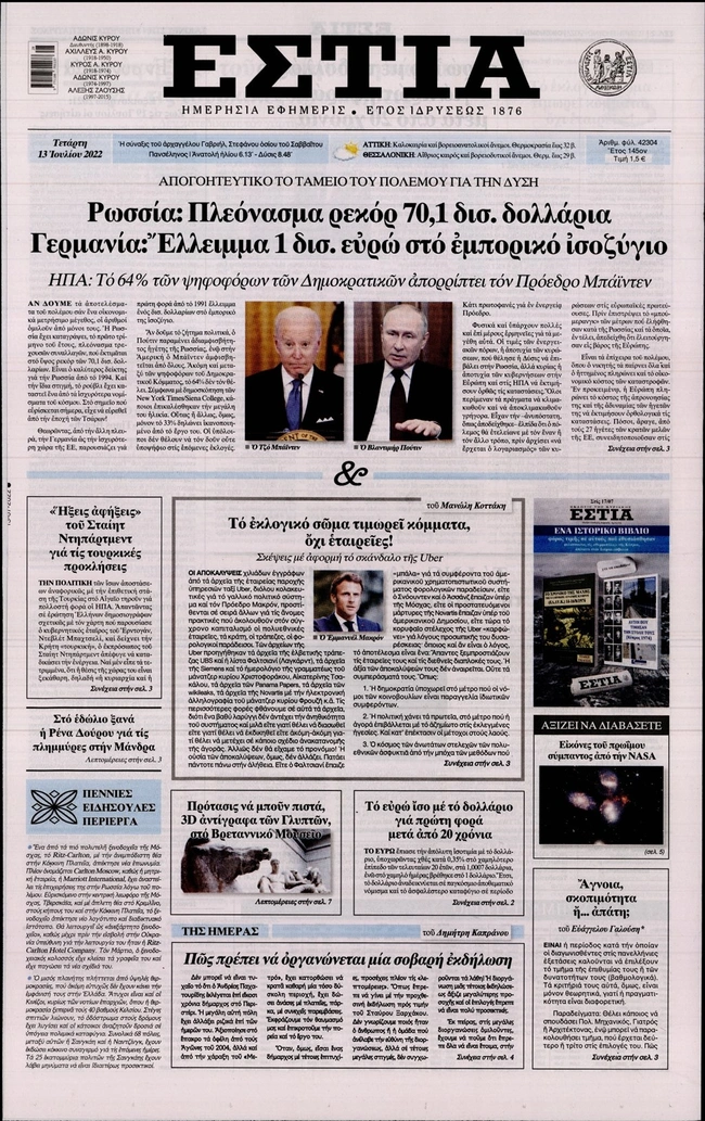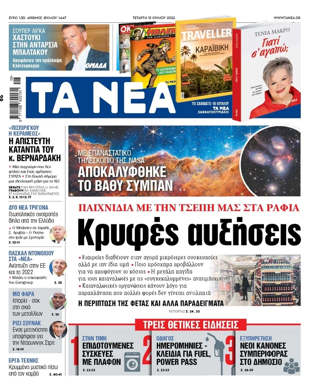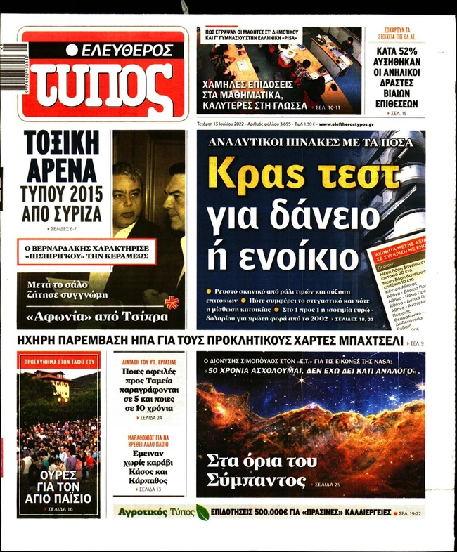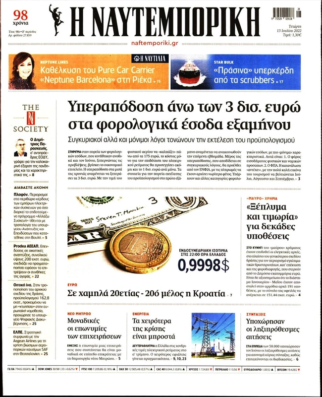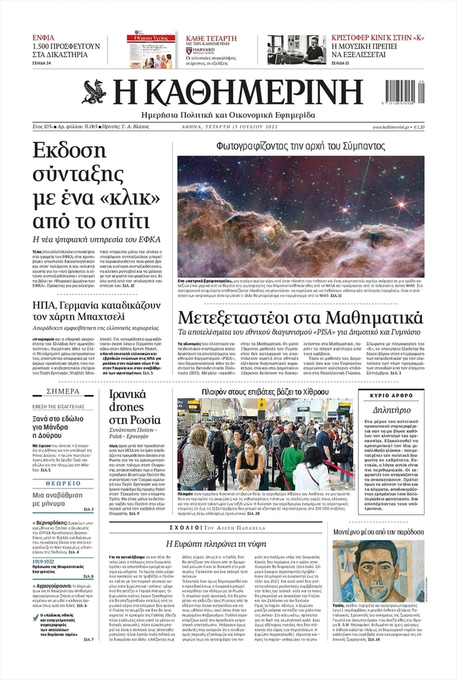 Τα πρωτοσέλιδα των ελληνικών εφημερίδων για σήμερα Τετάρτη 13 Ιουλίου. Δείτε τι φιλοξενεί στην πρώτη του σελίδα ο πολιτικός και οικονομικός Τύπος και τα θέματα της επικαιρότητας που ξεχωρίζουν.