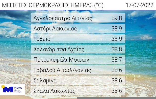 Καιρός: Στους 38-40 βαθμούς Κελσίου έφτασαν οι μέγιστες θερμοκρασίες στη χώρα σήμερα Κυριακή 17 Ιουλίου 2022, σύμφωνα με το δίκτυο αυτόματων μετεωρολογικών σταθμών του Εθνικού Αστεροσκοπείου Αθηνών / meteo.gr. Η υψηλότερη μέγιστη καταγράφηκε στο Αγγελόκαστρο Αιτωλοακαρνανίας, με 39.8 °C. Στον πίνακα που ακολουθεί παρουσιάζονται οι 8 σταθμοί που κατέγραψαν τις υψηλότερες μέγιστες θερμοκρασίες της ημέρας.