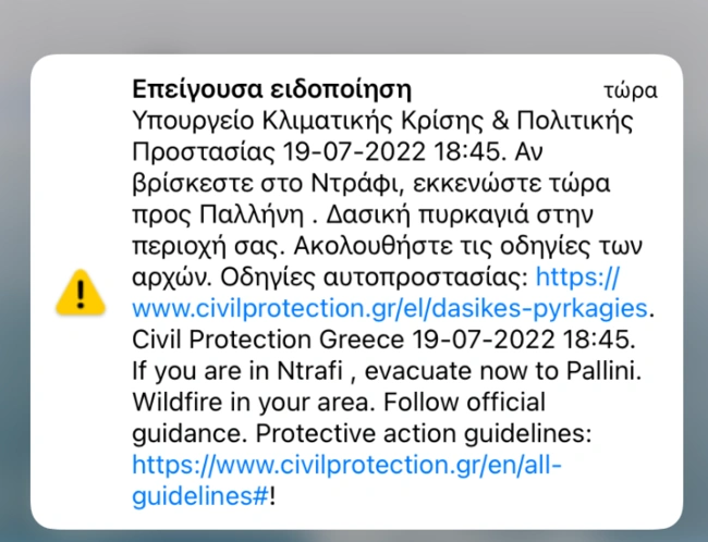Το 112 έστειλε μήνυμα στους κατοίκους στο Ντράφι της Πεντέλης να εκκενώσουν προς Παλλήνη. Η φωτιά που ξεκίνησε κοντά στη Μονή Παντοκράτορος είναι σε πλήρη εξέλιξη ενώ κινείται σε δύο μέτωπα. Τεράστια είναι η κινητοποίηση της Πυροσβεστικής με πάνω από 100 πυροσβέστες και 16 εναέρια μέσα. Το μήνυμα του 112 για εκκένωση στο Ντράφι γράφει τα εξής: «Αν βρίσκεστε στο Ντράφι εκκενώστε τώρα προς Παλλήνη. Δασική πυρκαγιά στην περιοχή σας».
