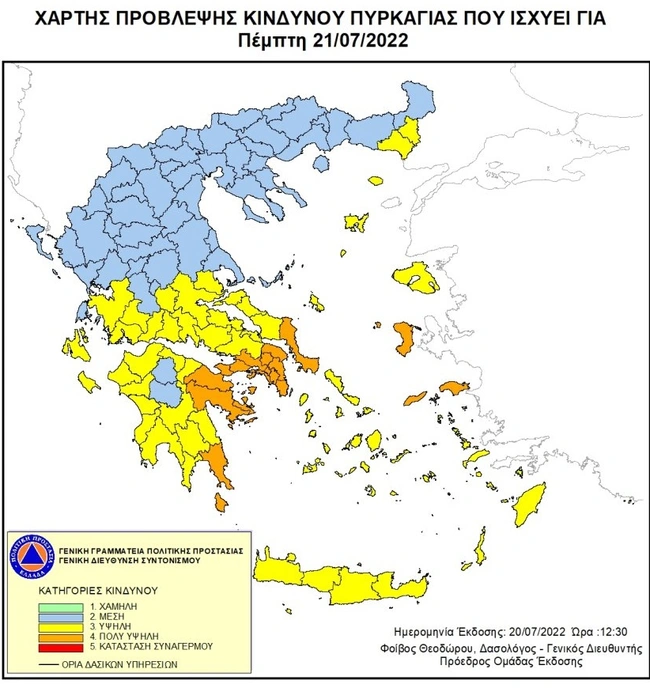 Οι Αρχές παραμένουν σε συναγερμό αφού και η αυριανή μέρα θα είναι δύσκολη. Σύμφωνα με τον χάρτη πρόβλεψης κινδύνου πυρκαγιάς της Πολιτικής Προστασίας, στην Αττική θα είναι ιδιαίτερα υψηλός την Πέμπτη (21/7). Για αύριο Πέμπτη 21 Ιουλίου 2022, προβλέπεται πολύ υψηλός κίνδυνος πυρκαγιάς (κατηγορία κινδύνου 4) για τις εξής περιοχές: