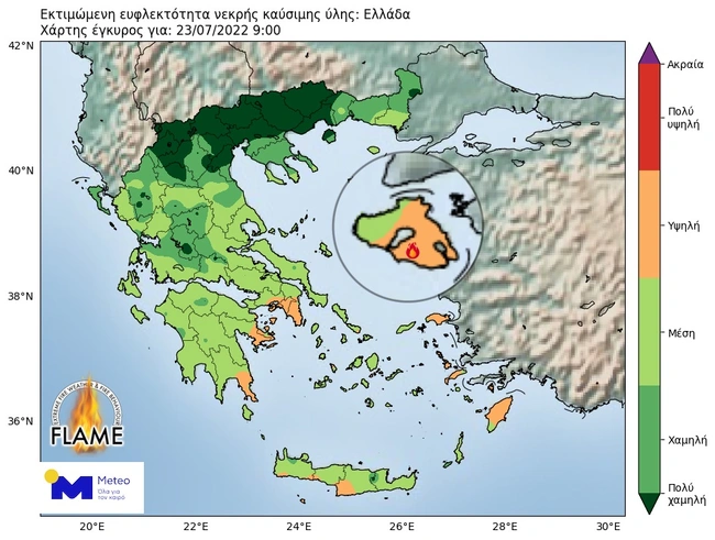 Για τις επόμενες ώρες και έως τα μεσάνυχτα (23.07.2022 17:00 - 24.07.2022 00:00) αναμένουμε σταδιακή βελτίωση των πυρομετεωρολογικών συνθηκών. Από νωρίς το πρωί (06:00) της Κυριακής 24.07.2022, οι πυρομετεωρολογικές συνθήκες θα παρουσιάσουν επιδείνωση. Σημειώνεται ότι η εκτιμώμενη υγρασία των νεκρών δασικών καυσίμων θα παραμείνει σε χαμηλά επίπεδα, καθιστώντας εύκολη την ανάφλεξη τους, τη διατήρηση και τη μετάδοση της φωτιάς ακόμα και κατά τη διάρκεια της νύχτας.