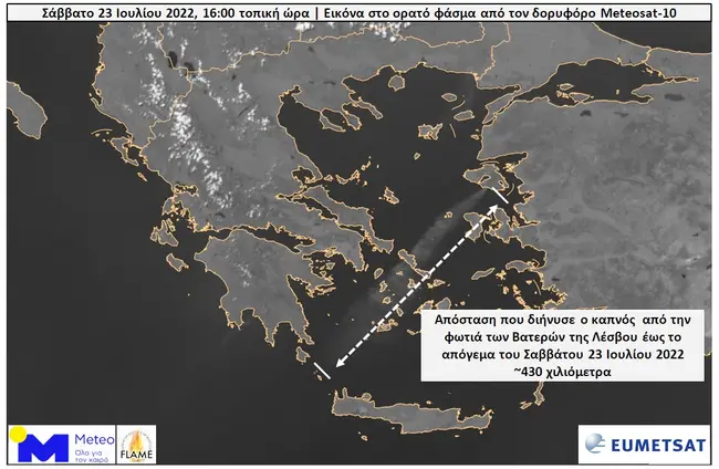 Παράλληλα, σε οπτική δορυφορική εικόνα που ανέκτησε και επεξεργάστηκε η πυρομετεωρολογική ομάδα FLAME του Εθνικού Αστεροσκοπείου Αθηνών (ΕΑΑ) / meteo.gr από τον Ευρωπαϊκό δορυφόρο METEOSAT-10, φαίνεται ότι οι ΒΑ άνεμοι που πνέουν πάνω από το Αιγαίο έχουν μεταφέρει τον καπνό της φωτιάς έως και 430 km νοτιοδυτικά, πάνω από τα Κύθηρα.