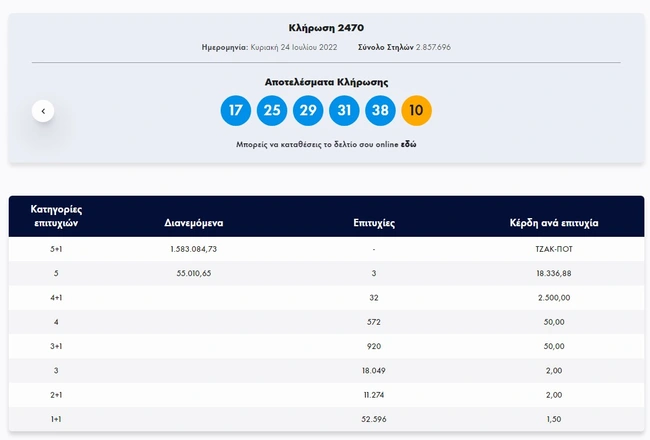 Σήμερα, Κυριακή 24 Ιουλίου 2022, στην κλήρωση Τζόκερ (2470) του ΟΠΑΠ, μοιράζεται στους τυχερούς της πρώτης κατηγορίας το ποσό των 1.500.000 ευρώ. Οι τυχεροί αριθμοί στη σημερινή κλήρωση Τζόκερ είναι οι εξής: 17, 25, 29, 31, 38 και Τζόκερ ο αριθμός 10.