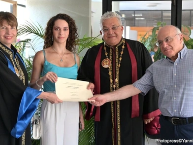 «Στις 22-07-2022, στην τελετή ορκωμοσίας του Τμήματος Μαθηματικών, η απόφοιτος κ. Ε. Χατζηδημητρίου έλαβε βαθμό πτυχίου δέκα (10), το πρώτο 10 της Σχολής σε όλα τα χρόνια λειτουργία της. Στη φωτογραφία η απόφοιτος, με τον πρύτανη του Α.Π.Θ., την Κοσμητόρισσα της ΣΘΕ και τον Πρόεδρο του Τμήματος Μαθηματικών», τονίζεται σε ανάρτηση του Πανεπιστημίου Θεσσαλονίκης στα social media.