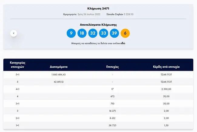 Σήμερα, Τρίτη 26 Ιουλίου 2022, στην κλήρωση Τζόκερ (2471) του ΟΠΑΠ, μοιράζεται στους τυχερούς της πρώτης κατηγορίας το ποσό των 1.800.000 ευρώ. Οι τυχεροί αριθμοί στη σημερινή κλήρωση Τζόκερ είναι οι εξής: 9, 18, 32, 33, 39 και Τζόκερ ο αριθμός 6.