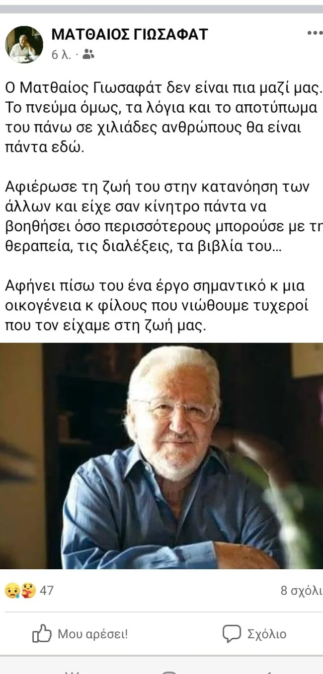 «Ο Ματθαίος Γιωσαφάτ δεν είναι πια μαζί μας. Το πνεύμα όμως, τα λόγια και το αποτύπωμα του πάνω σε χιλιάδες ανθρώπους θα είναι πάντα εδώ. Αφιέρωσε τη ζωή του στην κατανόηση των άλλων και είχε σαν κίνητρο πάντα να βοηθήσει όσο περισσότερους μπορούσε με τη θεραπεία, τις διαλέξεις, τα βιβλία του. Αφήνει πίσω του ένα έργο σημαντικό και μία οικογένεια και φίλους που νιώθουμε τυχεροί που τον είχαμε στη ζωή μας», αναφέρει η ανάρτηση.