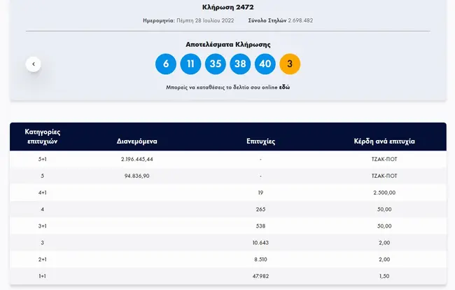Σήμερα, Πέμπτη 28 Ιουλίου 2022, στην κλήρωση Τζόκερ (2472) του ΟΠΑΠ, μοιράζεται στους τυχερούς της πρώτης κατηγορίας το ποσό των 2.200.000 ευρώ. Οι τυχεροί αριθμοί στη σημερινή κλήρωση Τζόκερ είναι οι εξής: 6, 11, 35, 38, 40 και Τζόκερ ο αριθμός 3.