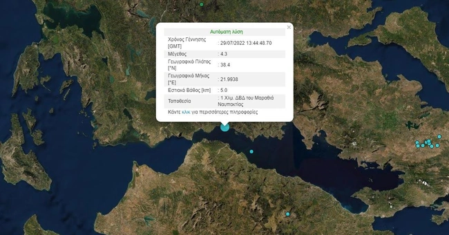 Σεισμός 4,3 Ρίχτερ σημειώθηκε το απόγευμα της Παρασκευής στην Ναύπακτο. Σύμφωνα με το Γεωδυναμικό Ινστιτούτο, το επίκεντρο της σεισμικής δόνησης εντοπίζεται στα 12,4 χιλιόμετρα βόρεια – βορειοδυτικά του Μαραθιά.
