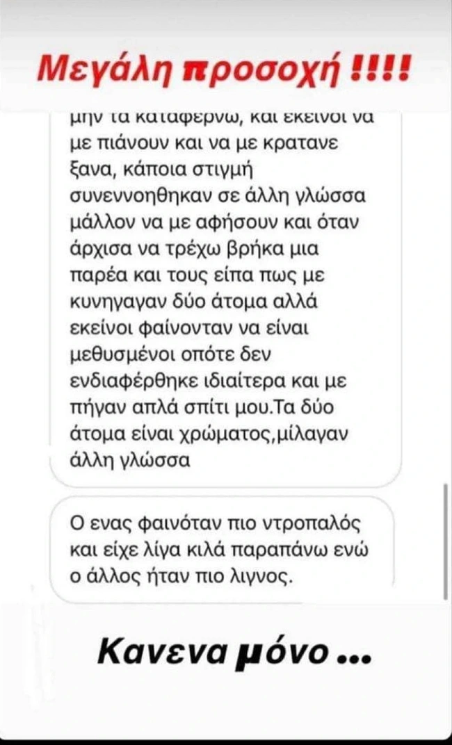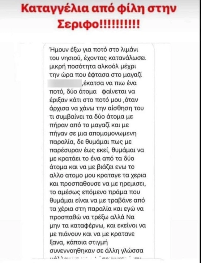 Το σκηνικό τρόμου το οποίο έζησε τα ξημερώματα της Δευτέρας κατά τη διάρκεια του βιασμού της σε παραλία της Σερίφου περιέγραψε η 23χρονη κοπέλα που κατήγγειλε το περιστατικό στο αστυνομικό τμήμα του νησιού, φτάνοντας σχεδόν ημιλιπόθυμη. Για τη φρίκη που βίωσε στα χέρια των δύο ανδρών που πιθανολογείται ότι ήταν από το Πακιστάν ή το Μπαγκλαντές στην παραλία Αυλόμωνας στη Σέριφο, το θύμα είχε αναρτήσει στο Ιnstagram λίγες ώρες μετά ένα story με όλες τις ανατριχιαστικές λεπτομέρειες.