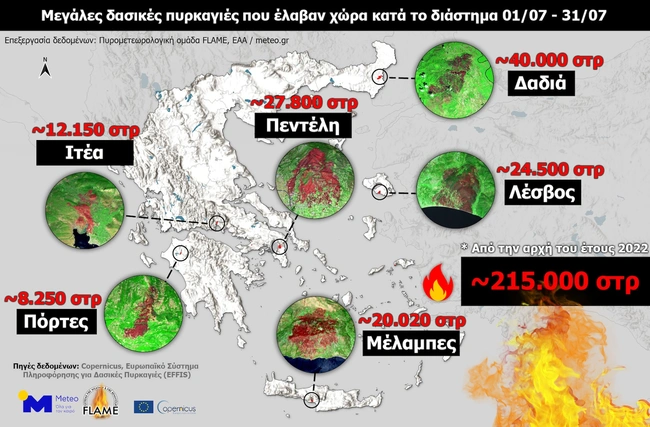 Οι μεγάλες δασικές φωτιές που εκδηλώθηκαν κατά τη διάρκεια του φετινού Ιουλίου στη χώρα μας επηρέασαν συνολική έκταση μεγαλύτερη των 130.000 στρεμμάτων. Συγκεκριμένα, η έκταση που επηρεάστηκε τον Ιούλιο (γύρω στα 132.720 στρέμματα) αντιστοιχεί περίπου στο 60% των αθροιστικά καμένων εκτάσεων της χώρας μας από την 1η Ιανουαρίου 2022 (περίπου 215.000 στρέμματα).