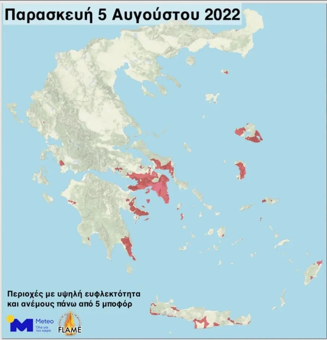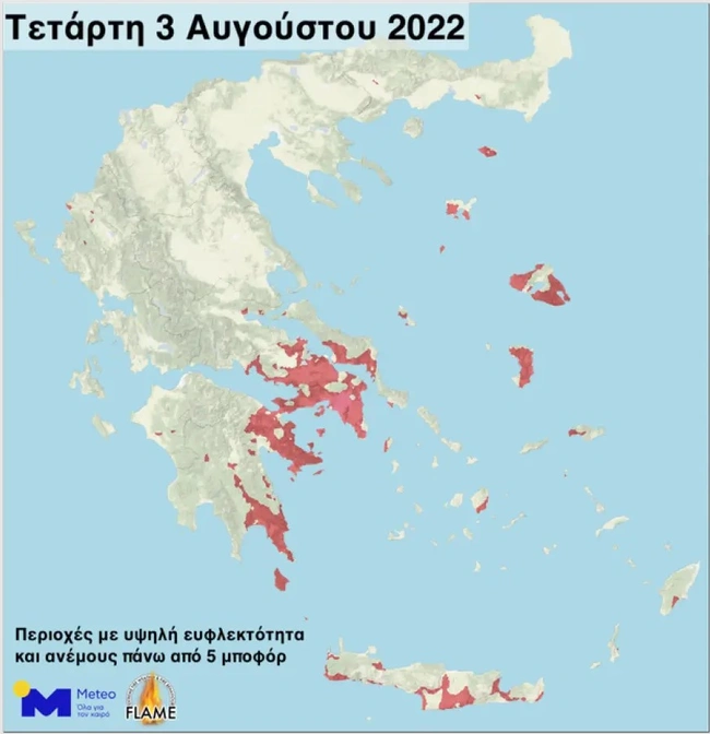 - Πολύ υψηλό δυναμικό για καθοδηγούμενες από τον άνεμο δασικές πυρκαγιές με δυνητικά υψηλά θερμικά φορτία σε Αττική (συμπεριλαμβανομένων των Κυθήρων), Βοιωτία, Κ. Εύβοια, Κορινθία, Αργολίδα, Λακωνία, Σαμοθράκη, Λήμνο, Λέσβο, Χίο και Σάμο.