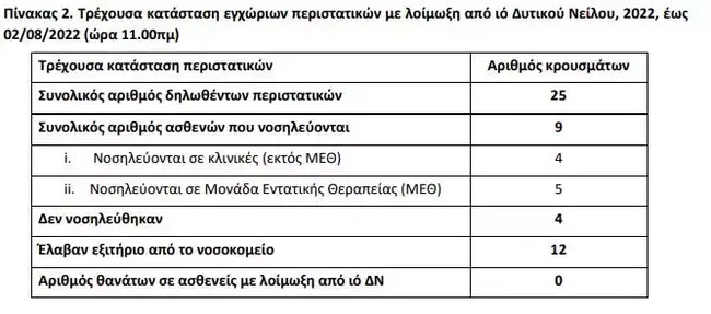 Τα κρούσματα του ιού του Δυτικού Νείλου αυξήθηκαν στη χώρα μας, καθώς στην τελευταία εβδομάδα υπάρχουν 12 νέα περιστατικά της λοίμωξης και συνολικά έχουν φτάσει τα 25. Σύμφωνα με τον ΕΟΔΥ από αυτούς οι 19 παρουσίασαν εκδηλώσεις από το κεντρικό νευρικό σύστημα (ΚΝΣ), όπως εγκεφαλίτιδα, μηνιγγίτιδα και οξεία χαλαρή παράλυση. Παράλληλα έξι είχαν ήπια νόσηση (πυρετό) ενώ δεν έχει καταγραφεί κανένας θάνατος στην χώρα μας.
