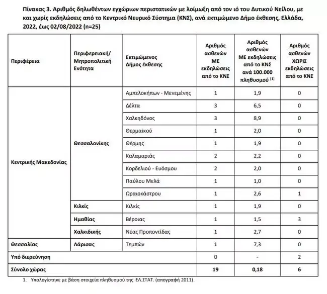 Κρούσματα από τον ιό του Δυτικού Νείλου έχουν καταγραφεί σε περιοχές της Κεντρικής Μακεδονίας, σε Λάρισα, Ημαθία, Κιλκίς και Χαλκιδική.